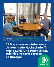 O Conselho de Administração e Finanças da Unespar aprovou, na data de hoje (03/12), o convênio com a Hochschule für Musik Karlsruhe, na Alemanha, consolidando mais um importante passo na política de internacionalização da Universidade.