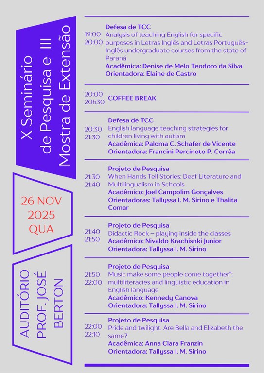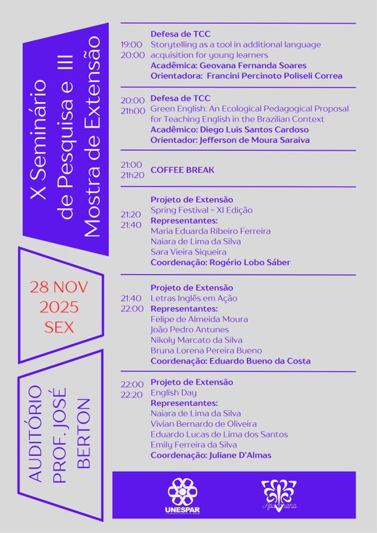 Curso de Letras-Inglês da Unespar Campus Apucarana promove X Seminário de Pesquisa e III Mostra de Extensão