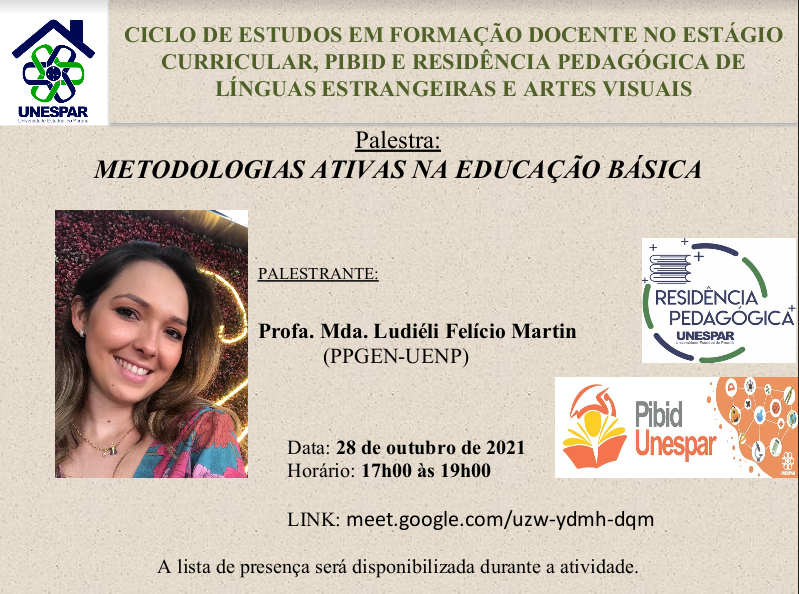 A Palestra "Metodologias Ativas na Educação Básica" será ministrada pela professora Mda. Ludiéli Felício Martin (PPGEN-UENP) no próximo dia 28/10.