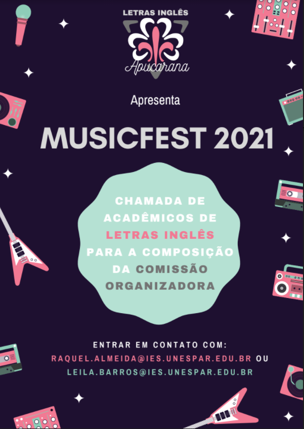 Alunos de Letras Inglês interessados em participar da Comissão Organizadora do MusicFest 2021 deverão entrar em contato com docentes do curso
