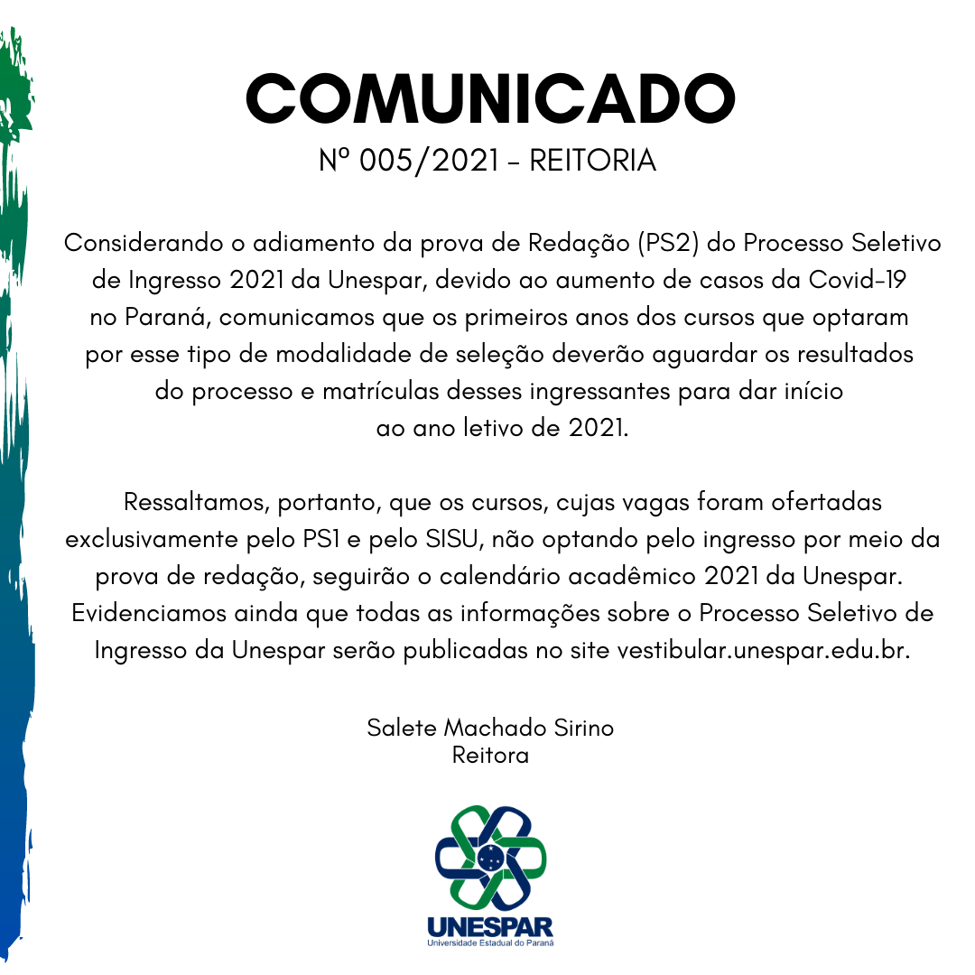 Comunicado da Reitoria sobre o início do ano letivo para os primeiros anos de 2021