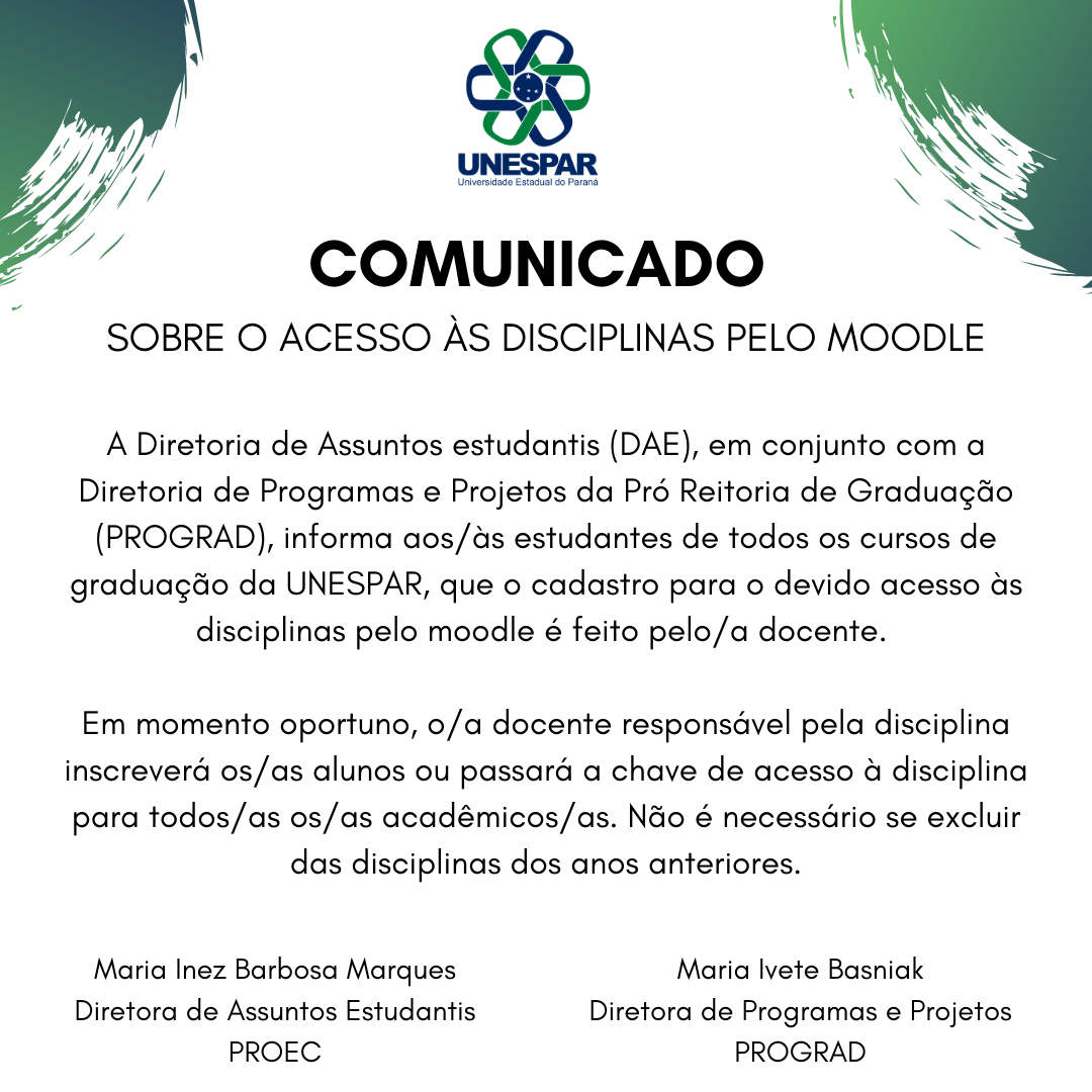 Comunicado sobre o acesso às disciplinas pelo Moodle