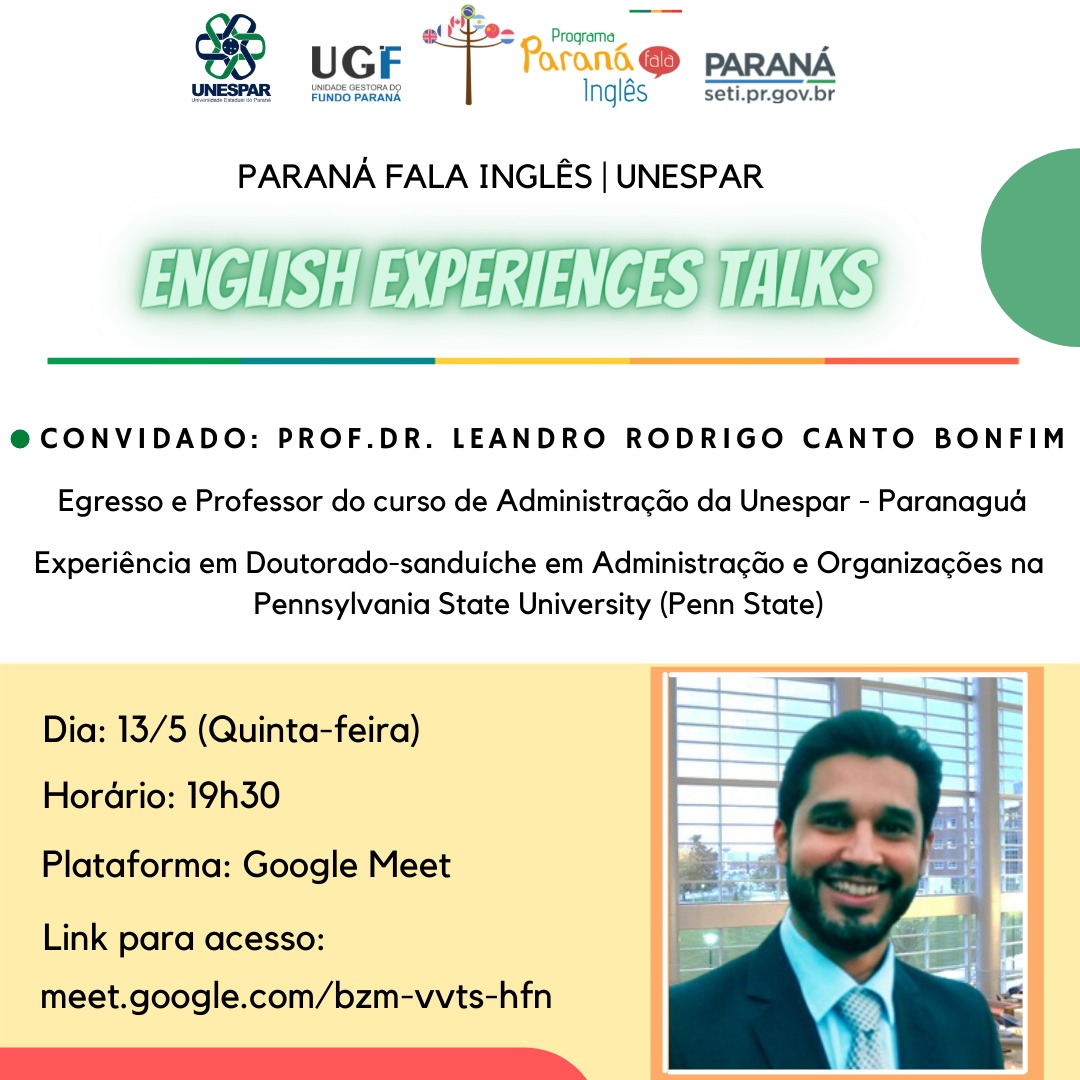 English Experiences Talks: entrevista de hoje com Prof. Dr. Leandro Rodrigo Canto Bonfim, as 19h30min.