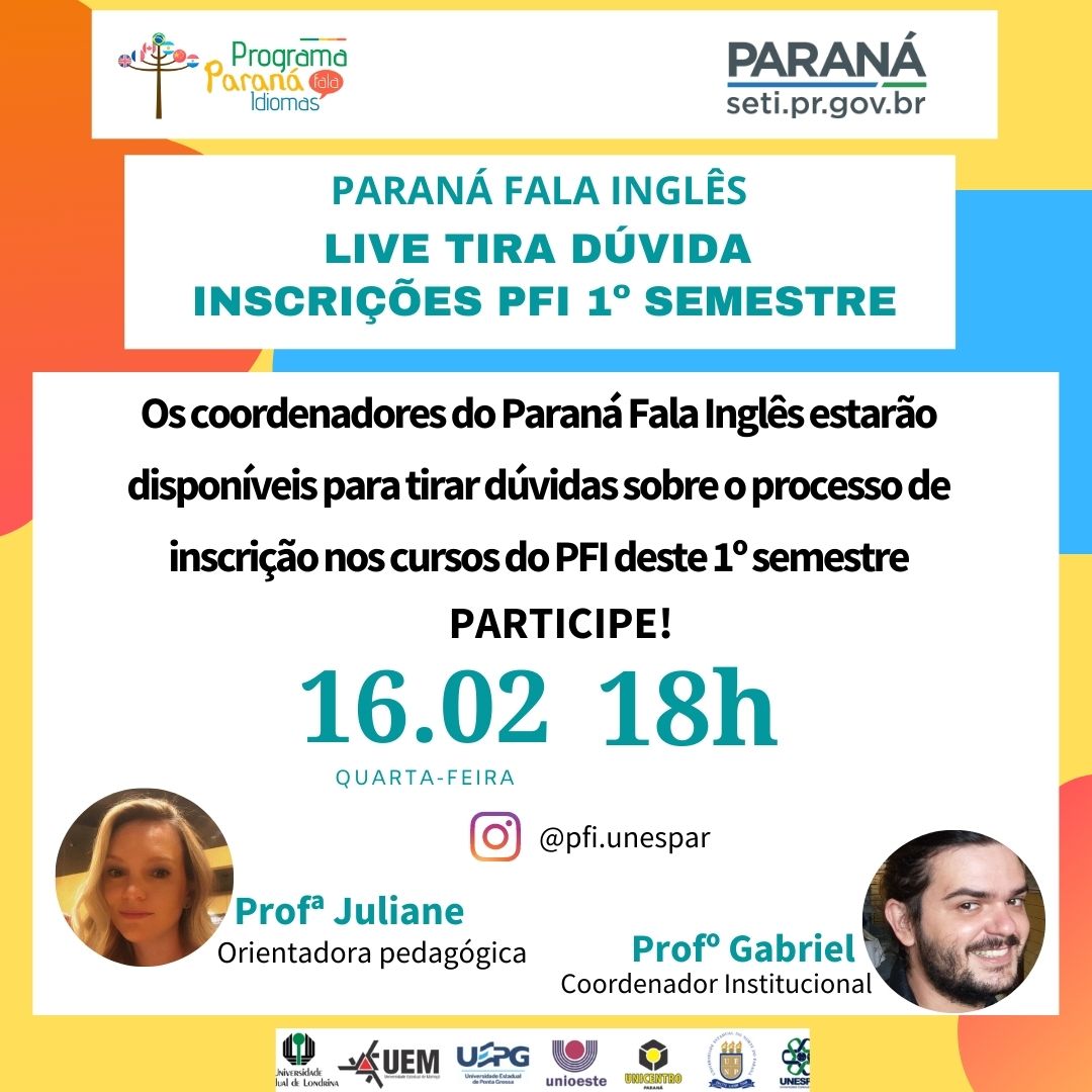 Estão abertas as inscrições para os cursos do 1⁰ semestre do programa Paraná Fala Inglês (PFI) entre os dias 10 a 24 de fevereiro!