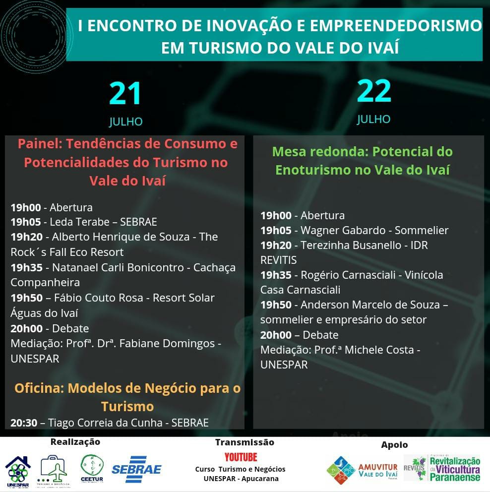 I Encontro de Inovação e Empreendedorismo em Turismo do Vale do Ivaí será realizado nos dias 21 e 22 de julho. Confira!