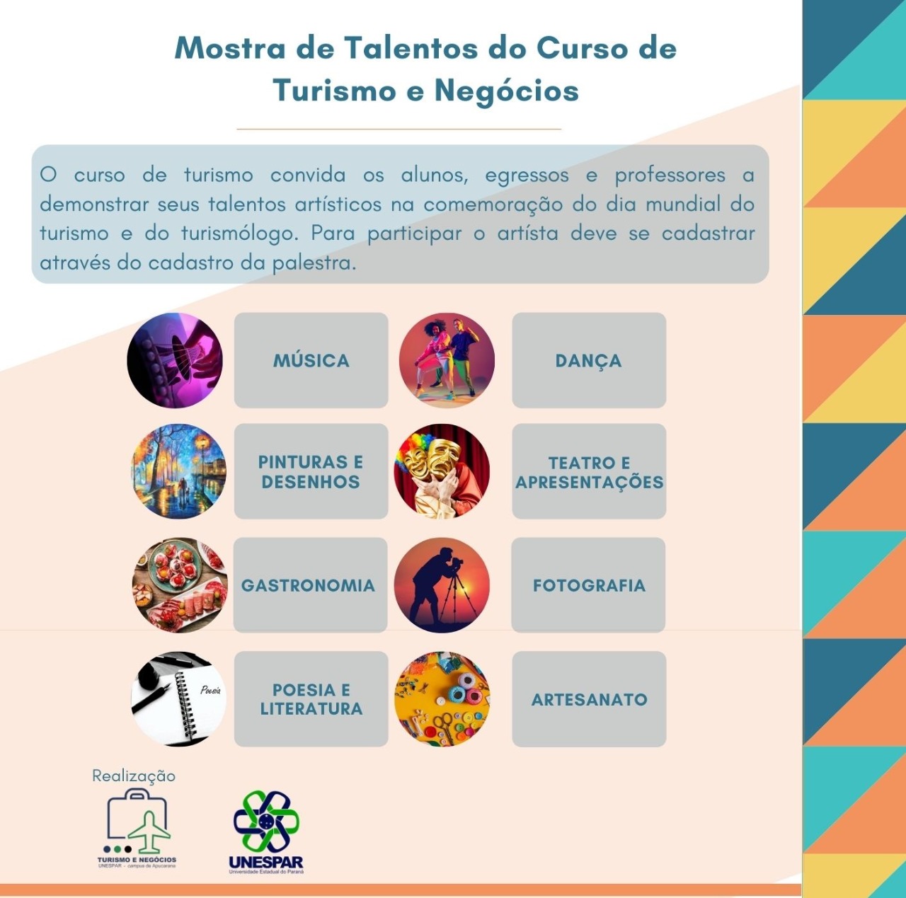 O curso de Turismo e Negócios da UNESPAR Apucarana promove no próximo dia 27 de setembro um evento em comemoração ao Dia Mundial do Turismo e Dia Nacional do Turismólogo.