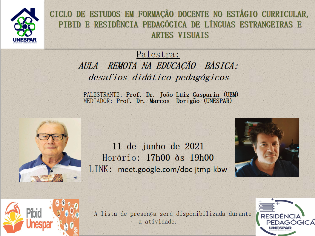Palestra "AULA REMOTA NA EDUCAÇÃO BÁSICA: desafios didático-pedagógicos" será ministrada pelo professor Dr. João Luiz Gasparin dia 11/6
