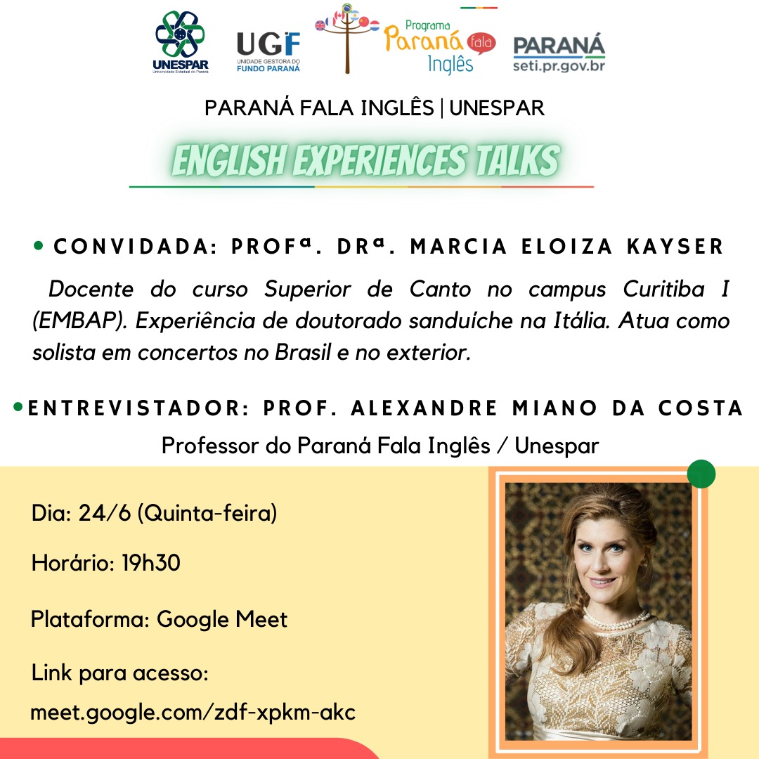 Paraná Fala Inglês fará evento hoje (24/6) com a Professora Dra. Marcia Eloiza Kayser, da Embap. Confira a partir das 19:30