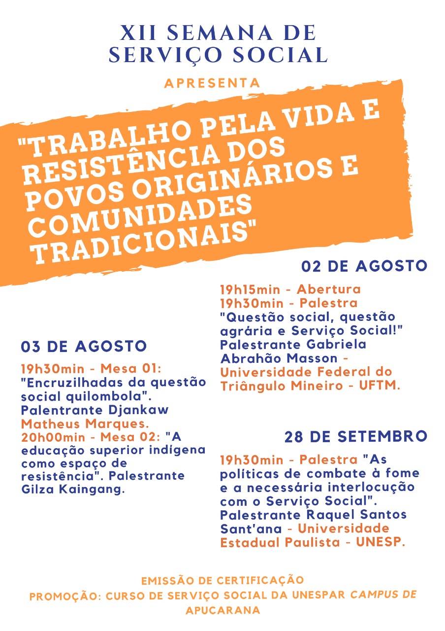 XXI Semana de Serviço Social, promovido pelo curso de Serviço Social do Campus de Apucarana, tratará do tema "Trabalho pela vida e resistência dos povos originários e comunidades tradicionais". Confira!