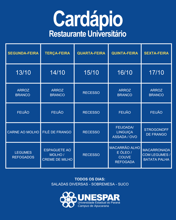 🍽️🥗 Cardápio do RU | UNESPAR Apucarana 🍛🥤 Confira o cardápio do Restaurante Universitário dos dias 13/10 à 17/10! 😋🎓 #RUUnespar #UnesparApucarana