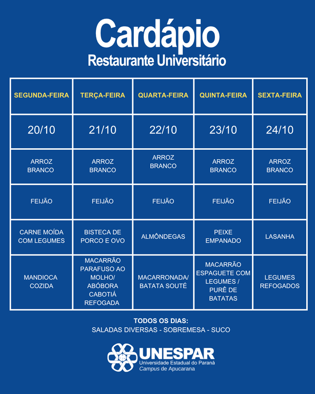 🍽️🥗 Cardápio do RU | UNESPAR Apucarana 🍛🥤 Confira o cardápio do Restaurante Universitário dos dias 20/10 à 24/10! 😋🎓 #RUUnespar #UnesparApucarana