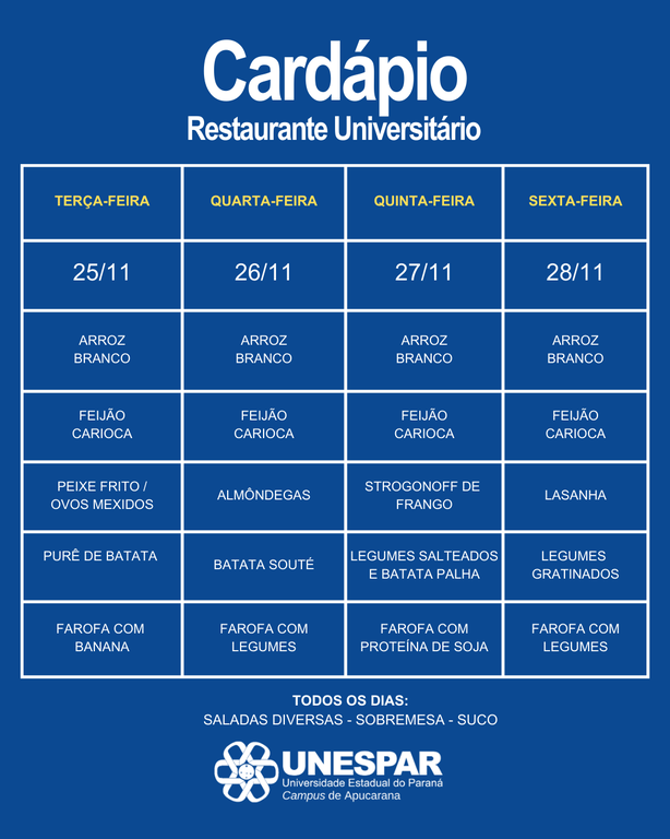 🍽️🥗 Cardápio do RU | UNESPAR Apucarana 🍛🥤 Confira o cardápio do Restaurante Universitário dos dias 25/11 à 28/11 ! 😋🎓 #RUUnespar #UnesparApucarana