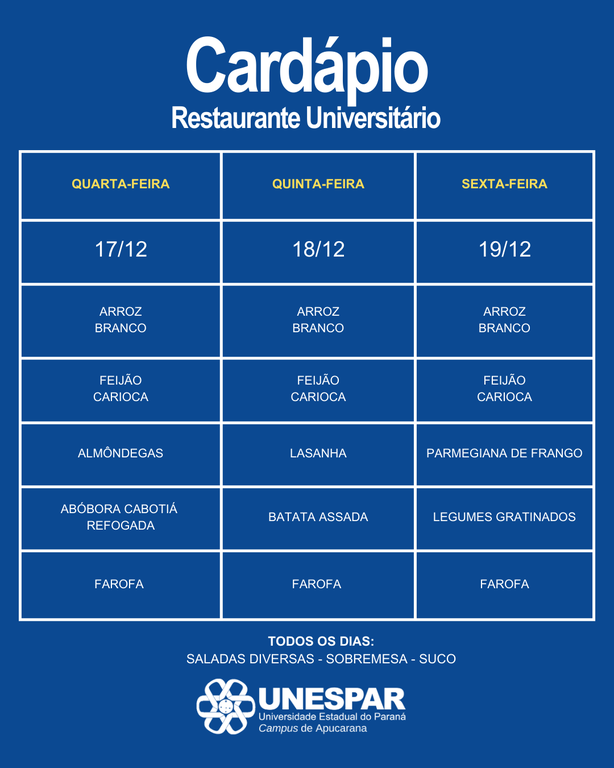 🍽️🥗 Cardápio do RU | UNESPAR Apucarana 🍛🥤 Confira o cardápio do Restaurante Universitário dos dias 17/12 à 19/12! 😋🎓 #RUUnespar #UnesparApucarana