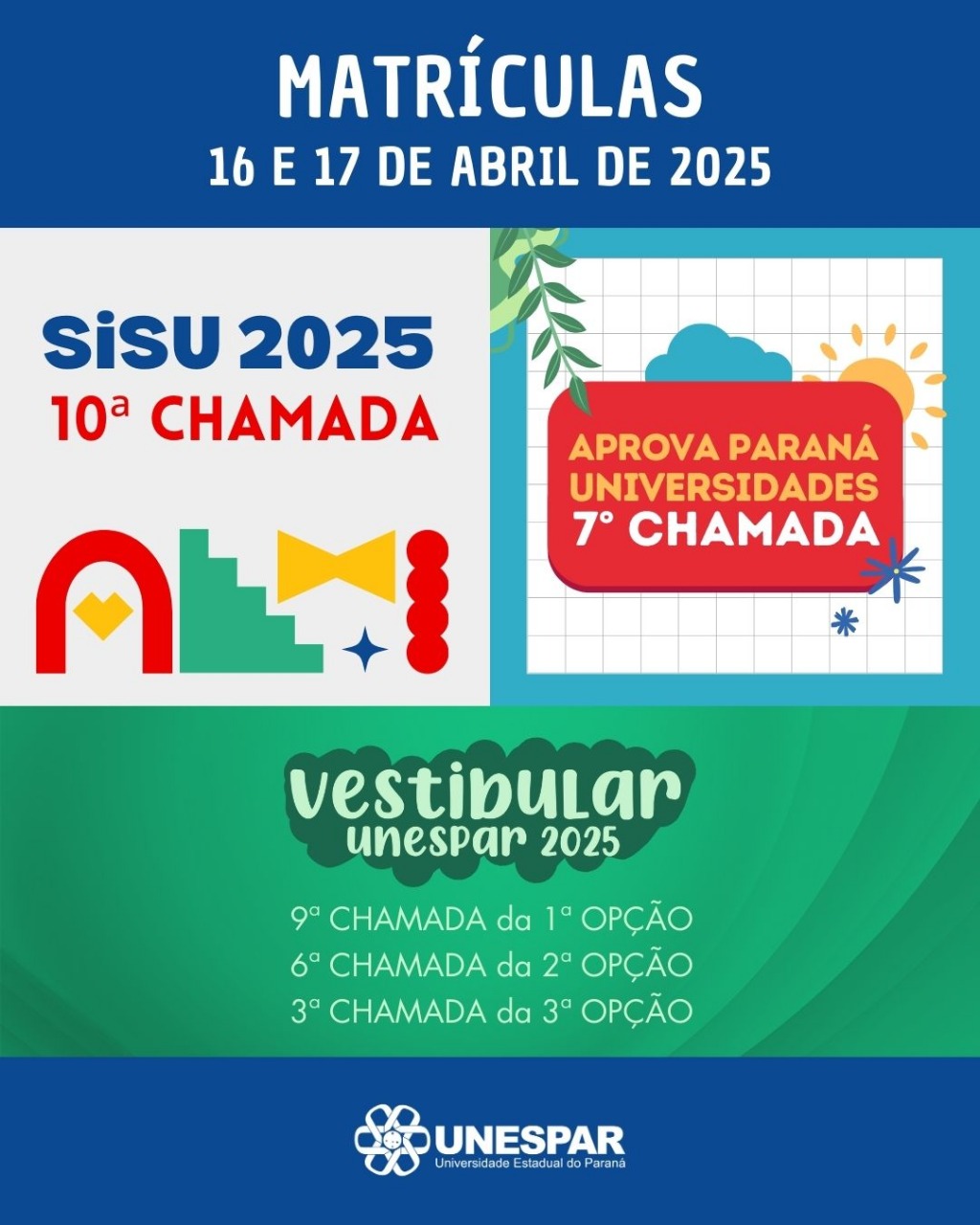 Unespar divulga novas chamadas do Vestibular 2025, Sisu e Aprova Paraná e convoca calouros para matrícula