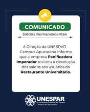 A Direção do Campus de Apucarana da Universidade Estadual do Paraná – UNESPAR informa que o antigo cessionário do Restaurante Universitário, Panificadora Imperador, já realizou a restituição dos saldos remanescentes aos usuários identificados em seu controle interno como credores.